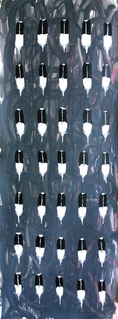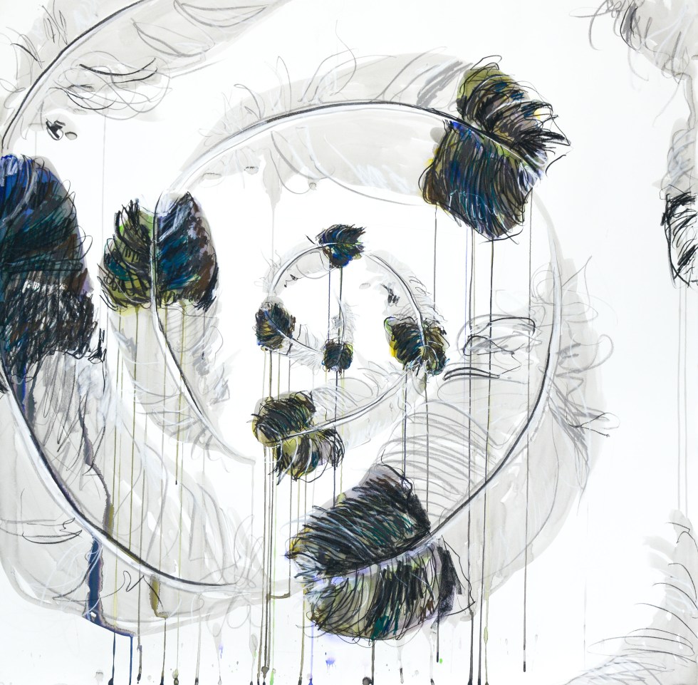 - Magpie Feather…, watercolour, ink and charcoal on paper, 114 by 114cm, 2017
